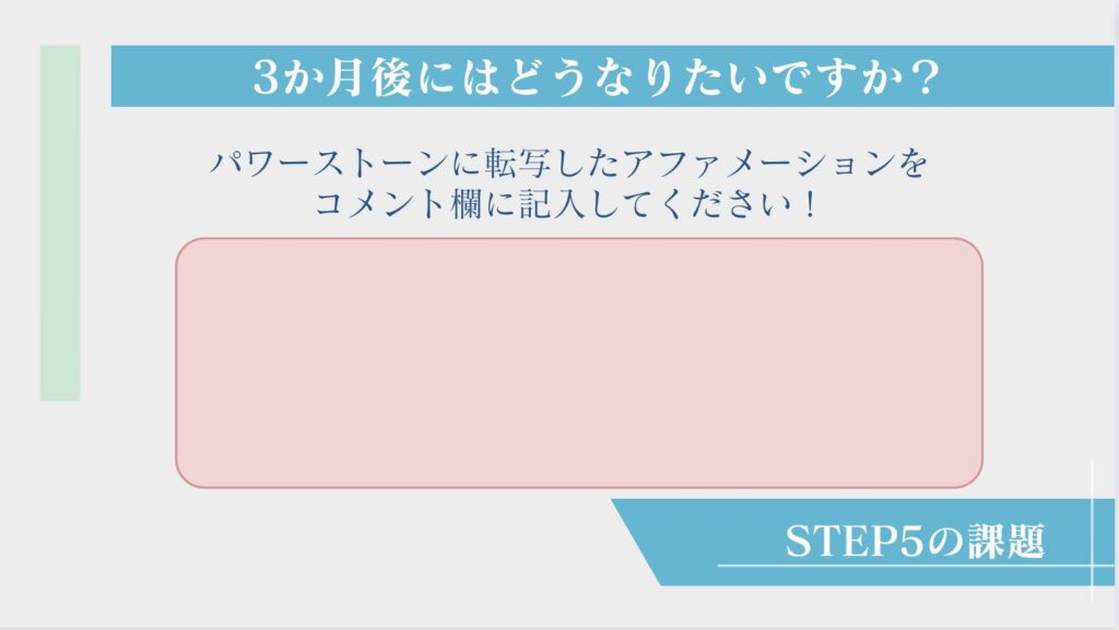 2023年12月28日 / 最終更新日時 : 2024年1月2日 7step 7step STEP5 STEP5お疲れ様でした。他の皆さんの課題がこちらに書き込まれます。 ※コメントは管理者による承認作業が必要なため、リアルタイムでは反映されません。 LINEに戻る “STEP5” に対して21件のコメントがあります。 コメントナビゲーション 過去のコメント さざえ より: 2024年4月1日 8:03 PM 私自身も元気で 自分にご縁して頂いた人を癒し__お互いに豊かな人生を送っている 返信 コメントナビゲーション 過去のコメント コメントを残す コメントをキャンセルメールアドレスが公開されることはありません。 ※ が付いている欄は必須項目ですコメント ※ 名前 メール サイト Select an image for your comment (GIF, PNG, JPG, JPEG):